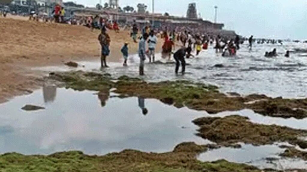 திருச்செந்தூா் சுப்பிரமணிய சுவாமி கோயில் கடலில் பக்தா் தவறவிட்ட தங்கச் சங்கிலி கடற்கரை பாதுகாப்புப் பணியாளா்களால் மீட்கப்பட்டது.