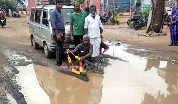சாத்தான்குளம் அருகே 10 ஆண்டுகளாகச் சாலை சீரமைக்கப்படாமல் உள்ள சாலையைச் சீரமைக்க வலியுறுத்தி நூதன போராட்டம் நடைபெற்றது..