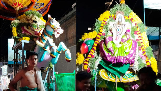 திருவிழாவின் எட்டாம் நாளான இன்று விசேஷ வழிபாடுகள் நடைபெற்றன. மாலையில் அலங்கரிக்கப்பட்ட குதிரை வாகனத்தில் சங்கர ராமேஸ்வரரும், எழில் கொஞ்சும் கிளி வாகனத்தில் பாகம்பிரியாள் அம்பாளும் எழுந்தருளினர். மேள தாளங்கள் முழங்க, தீவட்டி மரியாதையுடன் சுவாமி – அம்பாள் நான்கு ரத வீதிகளிலும் பவனி வந்தனர்.
